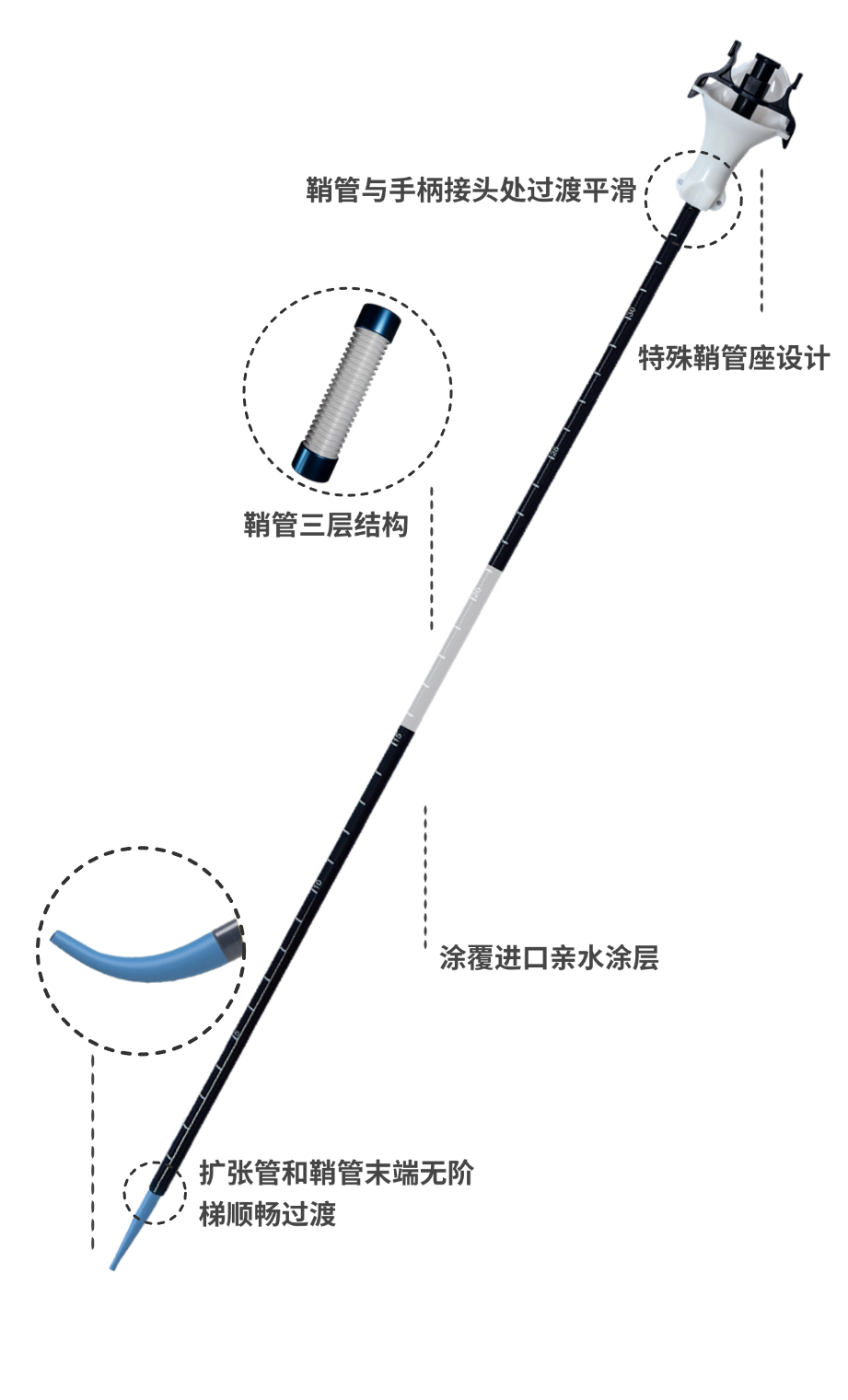 外层弹性体材质,舒适性好;中间夹层不锈钢弹簧圈,防止弯折、推送性更强;内壁为PTFE超滑层,减少鞘管与器械间的摩擦,器械通过性更佳;